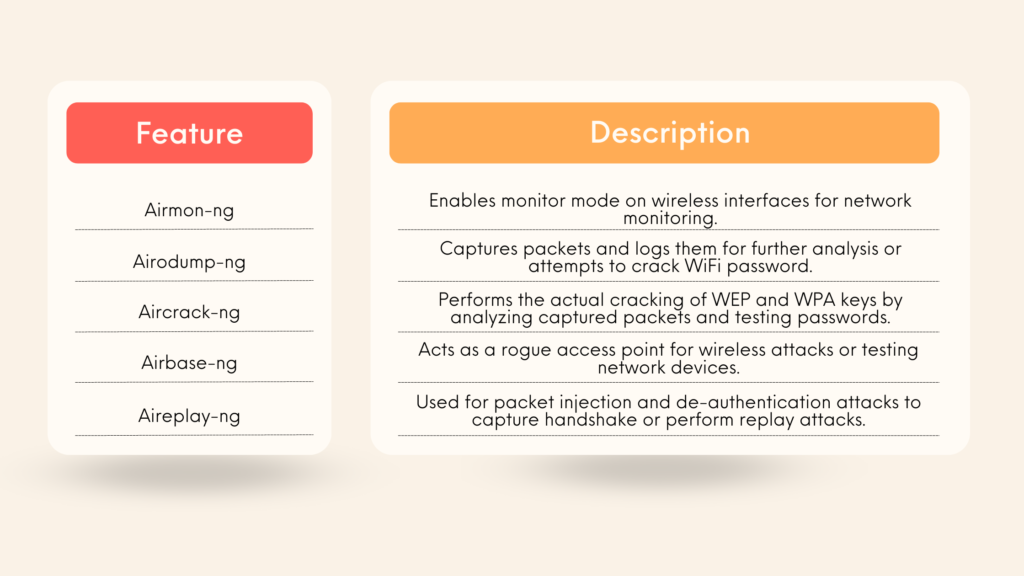 Aircrack-ng works by intercepting and analyzing the data flowing through Wi-Fi networks. It collects these packets and attempts to crack WiFi password using different methods. Here’s a step-by-step explanation of how it works: